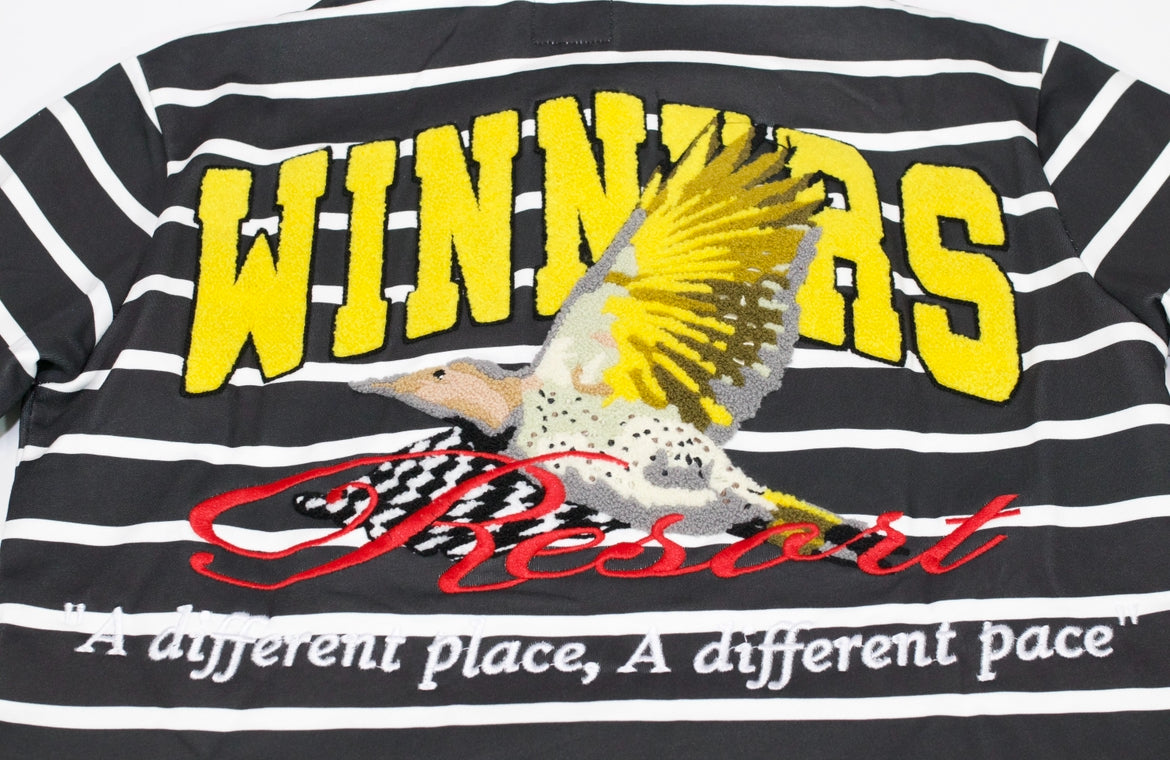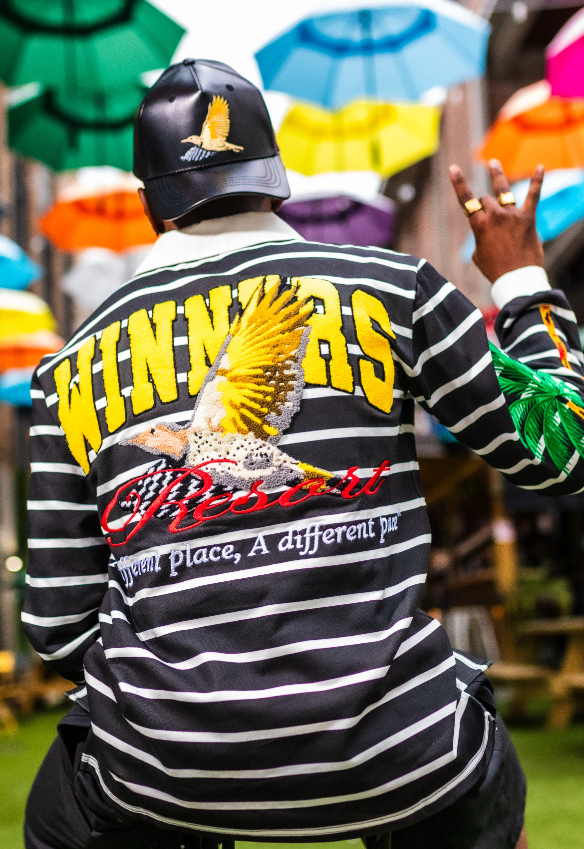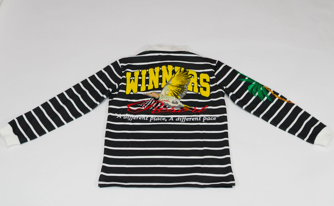 “The Resort Rugby fuses classic craftsmanship with luxury streetwear style. Made from Firm 400gsm 100% cotton, each piece features bold hand-artieched stripes, giving it a unique, artisanal edge. Classic Chenille Print of the Back. Durable, and effortlessly statement making this street-ready sophistication like no other. Fits true to size; for a relaxed look, size up.”